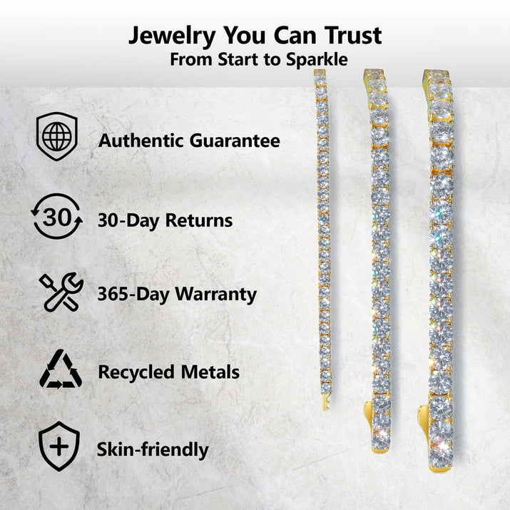 Our collection features exquisite 14k gold plating coupled with stunning 5A cubic zirconia stones, replicating the brilliance of diamonds. Enjoy high-end luxury paired with durability at a fraction of the price, making it a wise investment for your style.