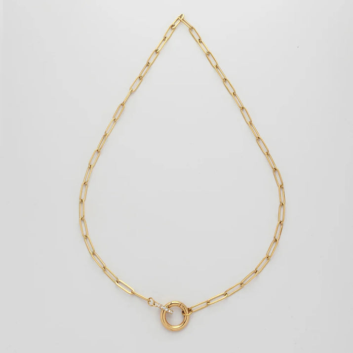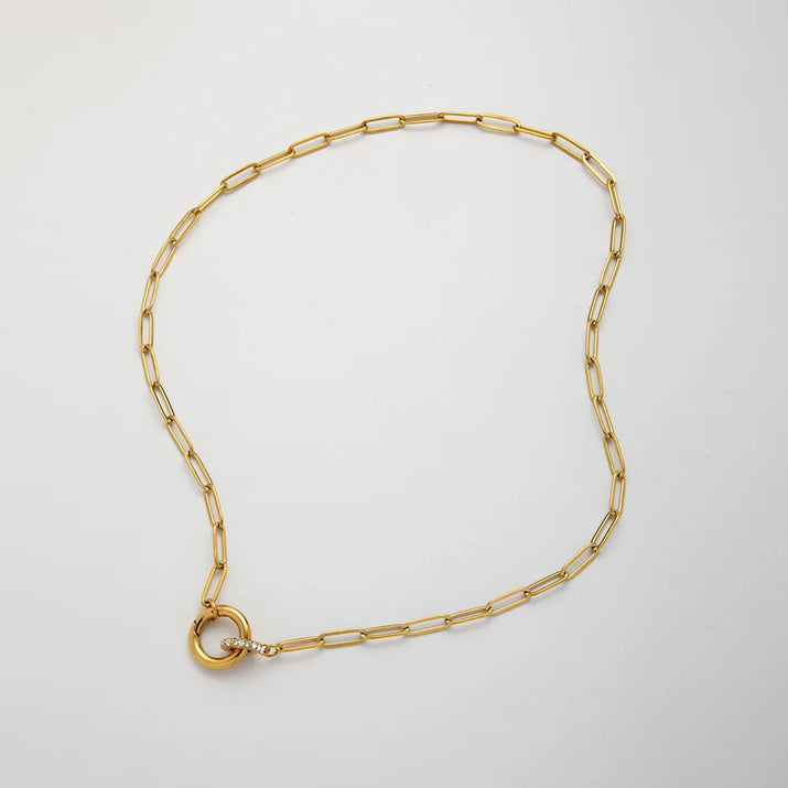 Non Tarnish Round Push Clasp Necklace 18k Gold Plated Stainless Steel Zircon Charm Paperclip Chain Necklace for Women