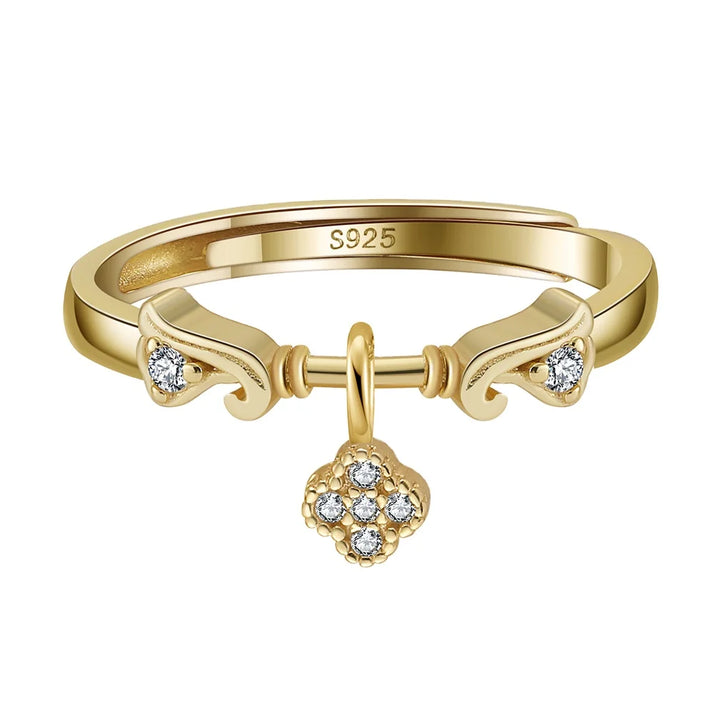 SR334 Open Adjustable Ring 14k Gold Plated with Zirconia Ring Four Leaf Clover Design Pendant 925 Silver Ring